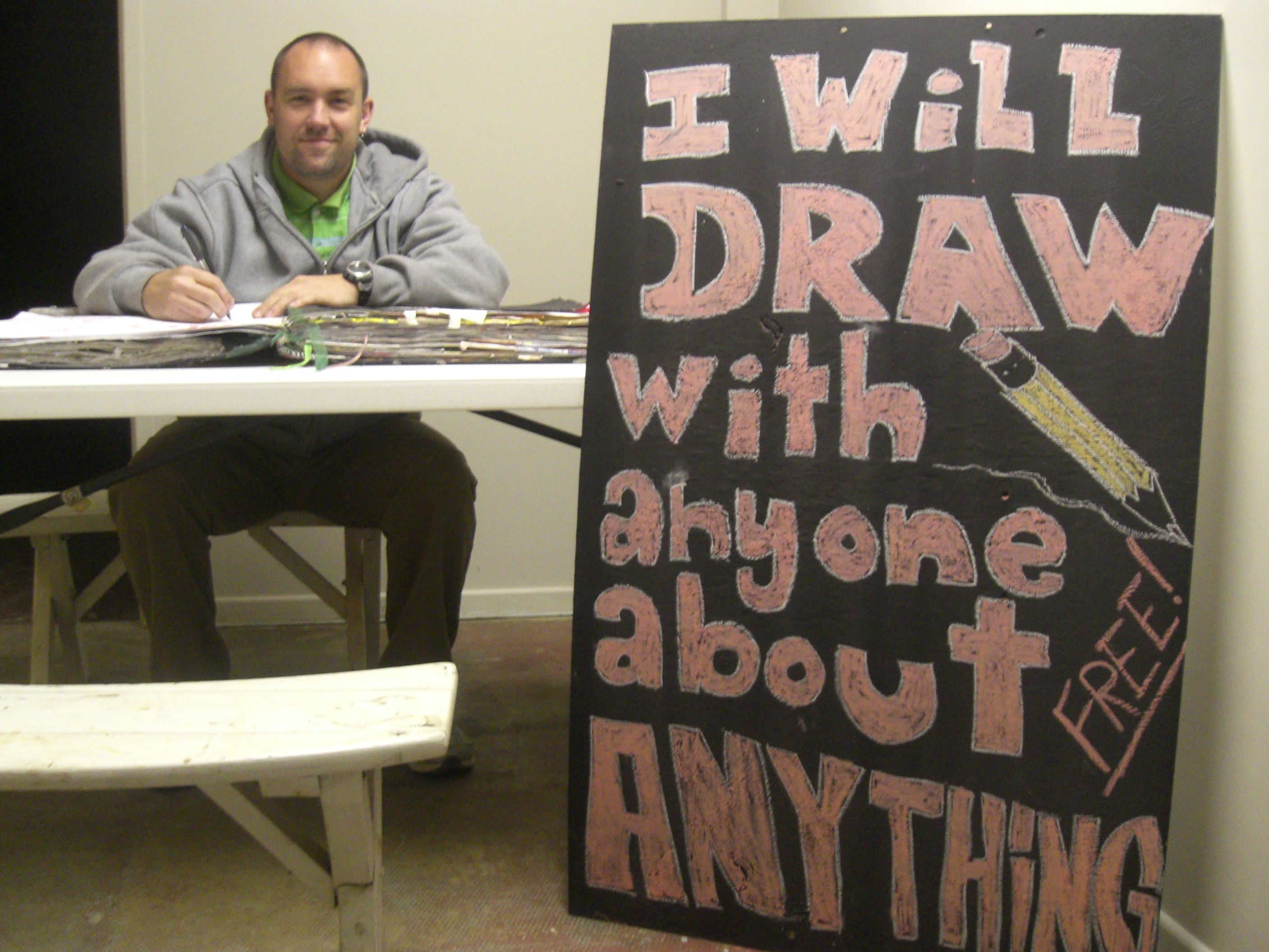 I set up this table in RAYGUN. When people approach I offer to draw with them about whatever they would like. If they don’t know what they want to draw about I keep a list of questions such as: