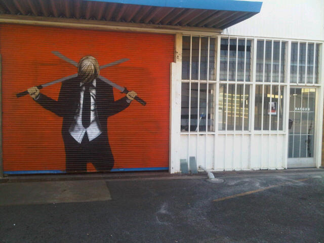So a friend and graffiti artist of ours Andrew Hulin drove up from Brisbane on Saturday and did a bit of spraying both in the Phat Burger garage and on the roller door next to the gallery . This is the beginning of his take on the RAYGUN art space/gallery. Thanks Andrew. tx
