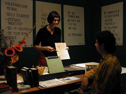 Volksboutique projects kept on evolving, surprising and questioning the audience and the art world. She franchised the boutique for Documenta X in Kassel in 1997, then abandoned her role as a salesgirl and mutated into a late-night talk-show host, a tour guide, a masseuse, a handbags and retro-looking stamp kits designer, etc. Turning everyday job into an artistic activity that could either be presented inside galleries or taken on the road inside carefully crafted trunks’