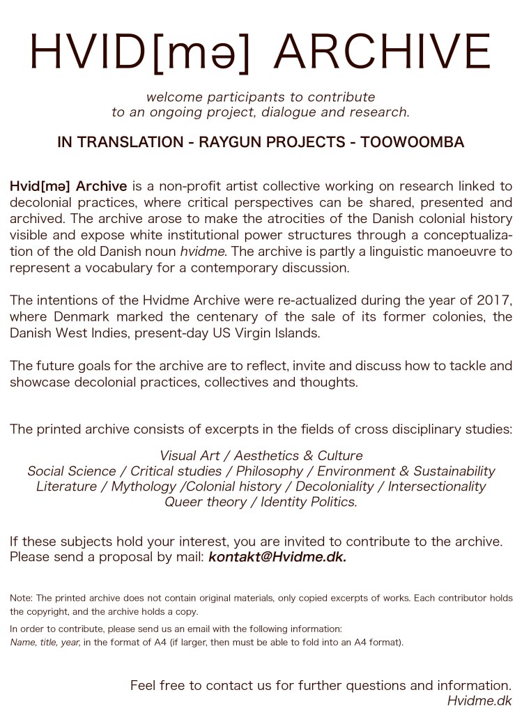 You are invited to contribute a reading, essay excerpt, visual print out, or some kind of printed matter that reflects your ideas concerning any of these contemporary discussions. Share and become a part of this dynamic archive by emailing your material to the HVID [me] ARCHIVE : mail@Hvidme.dk and make this a global conversation.